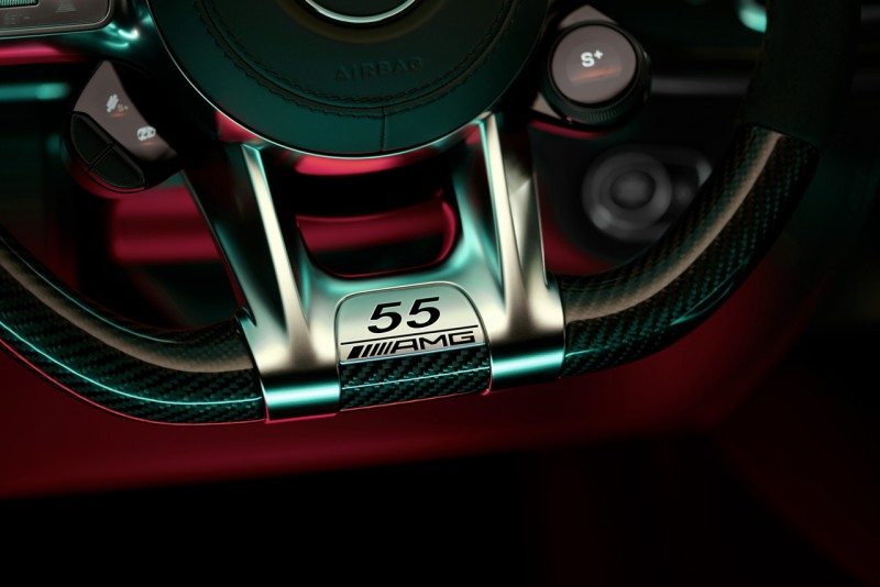 内装, 则採用经典红黑搭配,门槛饰板标有 AMG 字样附 红色照明、缝上红色 "Edition 55" 字样及红色缝线的高品质丝绒 AMG 踏垫,以及令人热血沸腾的 AMG 红黑双色 Nappa 真皮座椅,除此之外还装配 AMG 高性能 DINAMICA 平底跑车方向盘 (含AMG 55 铭牌)与刻画 AMG 厂徽印记的中央扶手,使热血气场由内而外散发,是热血车迷必收藏的动感 SUV。即刻下订,附赠 "Edition 55" 订制法兰绒抗静电室内车罩,让已经充满热血战斗氛围的坐驾更充满独特纪念意义。