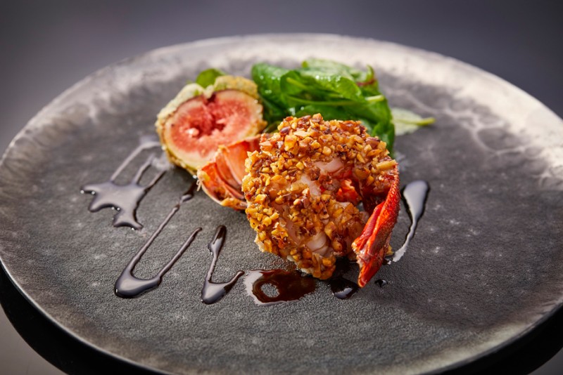 本季铁板烧秋季菜单以「马头鱼立麟烧 秋之菇 银杏酱」为主轴贯穿,以近年日料常见的高级食材马头鱼,保留鳞片于板台以高温油煎煮,鳞片瞬间耸立造就香脆口感并保有软嫩鱼身,挤上现榨清香的日本柚子汁,搭配马头鱼高汤及新鲜银杏切碎后燉煮至浓稠的汤底,鲜嫩细致的马头鱼以香煎出香气的秋菇衬底,最后刨上青绿香檬,邀请宾客在清爽气息中优雅告别暑气。「伊势龙虾 胡桃烧」将龙虾沾上胡桃于煎台上高温烹煮至半熟,放上巴西利、蒔萝及香萝卜叶等香草覆盖龙虾低温闷煎,佐以炸无花果天妇罗沙拉,最后浇淋无花果风味巴萨米克醋,为款待宾客献上丰美鲜甜的层次风味。甜点选用时令食材栗子为主题「栗子芭芭」,法国经典糕点芭芭内饀选用香甜的红豆泥,外层包裹上奶香浓郁的炼奶香堤,顶端再放上黑糖冰淇淋,建议淋上獭祭美酒,层层堆叠疗癒味觉的幸福滋味。