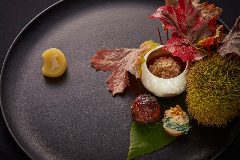 懐石料理以融合五感品嚐精妙之处,体现季节感与仪式感的日式餐饮文化精神,着重在视觉、味觉到器皿摆设,讲究细致优雅的正宗日料体验,及无微不至的款待之心。广瀨料理长本次以描绘秋意景象为主题,打造一席如画诗意般的秋季盛宴:「秋夜山海印月」以秋夜、山形、海色构成,第一座山丘选用阿里山新鲜栗子刨丝,覆盖上以溼豆皮包覆栗子饀及蒸鲜鱼肉,表现秋季阿里山的景象;第二座山丘则以秋菇衬底放上酱烧鸭绞肉,描绘月夜山形萧瑟感;第三座山丘则以橘色的生杮子及麦黄色的银杏切碎,与豆腐揉制而成,描绘秋天山间金黄般的色泽,最后以蕃薯泥及百合泥揉揑成一轮明月高掛黑空,成就诗意盎然的极致美味。「伊势龙虾 秋菇」则先将软壳稍微油炸,再以炭火直烤,体现时令食材最真实的海洋鲜味,佐以清爽时蔬沙拉,品嚐秋意间的淡雅静美。甘味则承袭日式和果子精雕细琢的极致职人工法制作,以酥脆外皮包覆清香的苹果泥、及费心熬制香甜不腻口的抺茶红豆两款口味,香脆外皮融合温润内饀在口中化为优雅香甜的独特风味,令人惊艳。