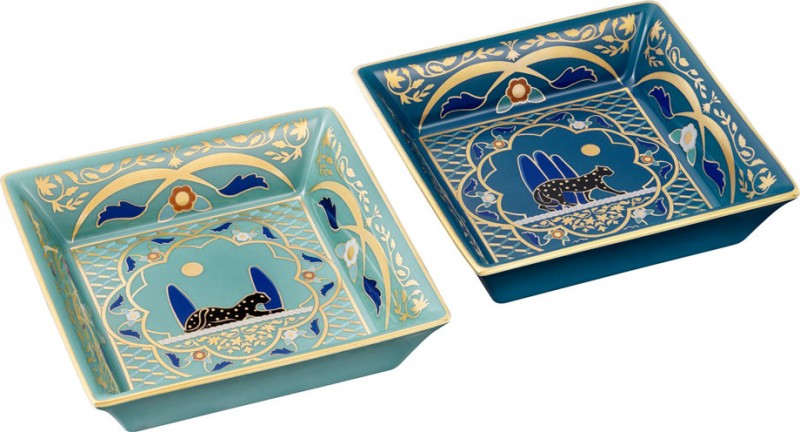 一套2件Panthère de Cartier美洲豹托盘 小型款,利摩日白陶瓷,缀有绿色和蓝色蔓藤花纹图案,山羊麂皮底座。 参考价格约NT$ 12,300 。