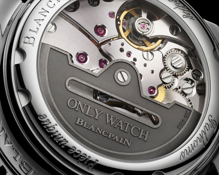 表款搭载的是1315机芯,在透明底盖下方可以一眼看见採用NAC铂基合金镀层,其上刻有”ONLY WATCH BLANCPAIN”字样的自动盘,而机芯零件的修饰打磨也能在此看得一清二楚。机芯含有硅游丝摆轮,有助于强化抗磁效果以及提升走时精准度,而且它内部还设有三枚发条盒,足以替手表提供长达5天的动能,放眼现在市场上的自动潜水表,这种动能都还是很充足的水准。
