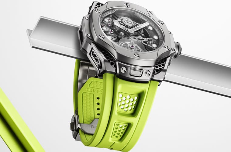 虽然表壳、表冠等零件去除了橡胶包覆或改为比较低调的橡胶顏色,但是宇舶替Big Bang Samuel Ross极光绿陀飞轮搭配的橡胶表带(表带局部同样有蜂巢状结构)还是选择了第一眼印象强烈的极光绿色调,而从上下表耳的梯形按把可知,Big Bang Samuel Ross极光绿陀飞轮拥有宇舶专利One Click表带快拆系统,品牌也贴心地另外提供黑白两色橡胶表带给表主(设计也都蕴含立体蜂巢状结构),让人可以随时视场合更换不同顏色的表带,搭配性因而更加全面。