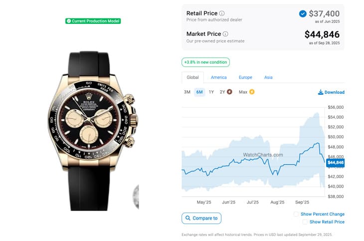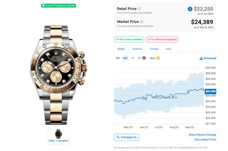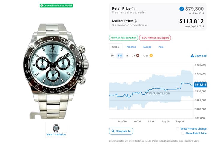 到了2025年9月底,当现行版Daytona进入二级市场的款式与数量愈来愈多,加上热门表行情下修的趋势似乎已到谷地反弹的地步,因此前述的六种型号身价起起伏伏后,比起半年前大多有所成长。同样由WatchCharts的资料可见,目前Daytona各款最新报价分别是钢壳白面126500LN-0001:31,820美金(约合台币97万)、钢壳黑面126500LN-0002:27,486美金(约合台币83万7)、半金时标镶钻款126503-0002:24,389美金(约合台币74万3)、永恒玫瑰金款126505:50,299美金(约合台币153万3)、黄金款126518LN:44,846美金(约合台币136万7),以及铂金款126506:113,812美金(约合台币347万)。之前受到美国对等关税政策、通膨疑虑等因素影响,以及黄金价格持续高升的情况下,导致贵金属表壳和半金表壳的Daytona今年以来二级市场行情纷纷走高,但是到了8月后,变成铂金、半金和两款钢壳小有成长,尤其铂金款一个月前后的成长幅度吧较明显,反而K金款式陷入不进反退的局面。
