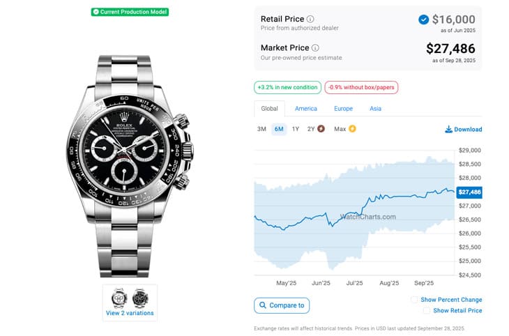 根据高级手表市场调查研究机构WatchCharts的资料,现行版Daytona系列各种材质在2025年4月时二级市场的价格早已经开始由高点往下走,钢壳白面126500LN-0001那时的行情为30,904美金(约合台币94万2)、钢壳黑面126500LN-0002为26,589美金(约合台币81万)、半金时标镶钻款126503-0002为23,544美金(约合台币71万7)、永恒玫瑰金款、黄金款、铂金款型号126505、126518LN、126506的身价依序是49,805美金(约合台币151万8)、43,436美金(约合台币132万4)和107,210美金(约合台币326万8),除了永恒玫瑰金之外,金额大多数在定价以上,系列的高人气由此可见一斑。