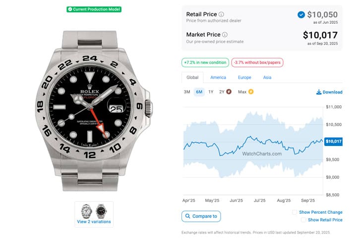由此可知在2022~2025年定价连涨了四次之后,手表已经回不去2字头的数字,那麼这款表在二级市场上的表现又是如何?根据高级手表市场调查研究机构WatchCharts的资料,白面与黑面的探二从2022年第2季以来行情持续缓缓走跌,到2025年时似乎已经有点开始要从谷底奋起的跡象,白面探二在2025年3月的行情为10,478美金(约合台币31万7)的水准,黑面探二的身价又还略低一些,大概是9,801美金(约合台币29万6),这时手表的身价离2022年第1季的历史巔峰(约15,000美金)已经有一段距离,而且从那之后价格就开始从11,000美金区间稳步往10,000美金的水平线下调,黑面甚至已经跌破万元美金。