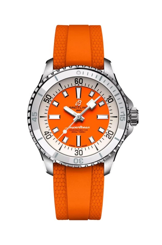 Superocean系列承袭百年灵1960年代潜水表作品Slow Motion而来,包括大型夜光时标、方形指针和对比存在感强烈的表圈等。蜕变为现代的Superocean系列后,百年灵于手表材质、配色层面皆展现今日的先进水准与开放态度,例如以陶瓷表圈强化手表的保护性,另以各种顏色鲜艳的面盘打破传统潜水表固守黑色面盘的框架。当然手表该有的防水、防震等专业机能也比20世纪中期进步许多,就连手表表带的折叠扣也有至多可调节15mm的快调设计,让佩戴者能将手表戴的牢又戴得舒适。这款36mm的Superocean潜水表拥有抢眼的橘色面盘,搭配同色橡胶表带,面盘周围的斜面刻度以白色与陶瓷表圈的顏色呼应,包括指针和时标的Super-LumiNova®夜光涂层也是白色的,由此达到白、橘两色的对比感以及强烈的个性主张,在陆地上通常远远就能看到手上的这只表,辨识度眼见为凭。