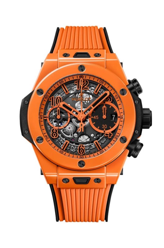 宇舶自从2018年左右研发出彩色陶瓷表壳后,接下来陆续延伸出各种顏色的彩色陶瓷作品,例如海蓝色、红色、卡其色、天蓝色、黄色、灰色、丛林绿等等。品牌在2024年新增首度研发成功的橘色陶瓷,并将之应用在Big Bang Unico计时码表上。採用橘色陶瓷制作表壳的Big Bang Unico计时码表,其外观被拋光得晶亮,从表壳、底盖外围到表圈都同样反射出抢眼的光芒,至于表壳中层、计时按把与表冠等零件则以不同材质但同样的黑色调呈现。此外品牌将面盘外缘的刻度环、时标、指针、小表盘刻度环等都用橘色妆点,包括面盘12点方向的品牌Logo也要是橘色,这些橘色细节在银、灰、黑色为主的机芯组件衬托下显得清楚易读,阅读时间和欣赏机芯结构成了既统一又彼此独立的事,设计颇富巧思。