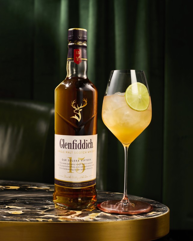 ▲格兰菲迪15年单一麦芽威士忌调制的「The 1959 Spritz」,结合梨子利口酒与气泡水,呈现清爽果香。(格兰父子提供)