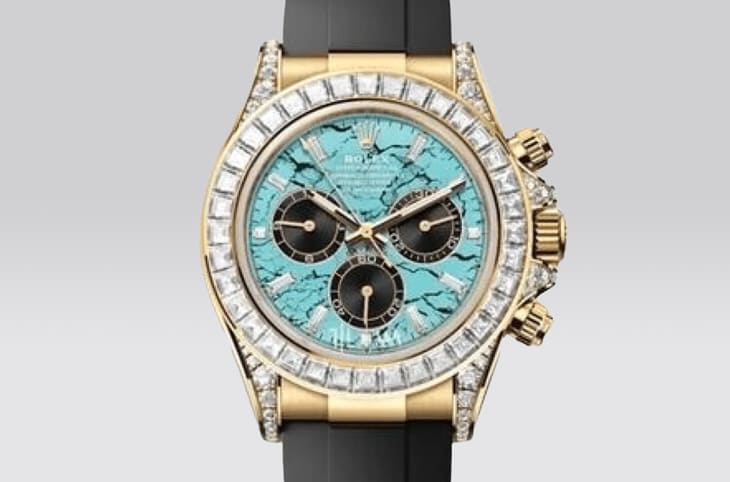 ▲Daytona 126538TBR以黄金表壳结合绿松石蓝面与满钻外圈,展现劳力士顶级宝石镶嵌工艺与收藏价值。