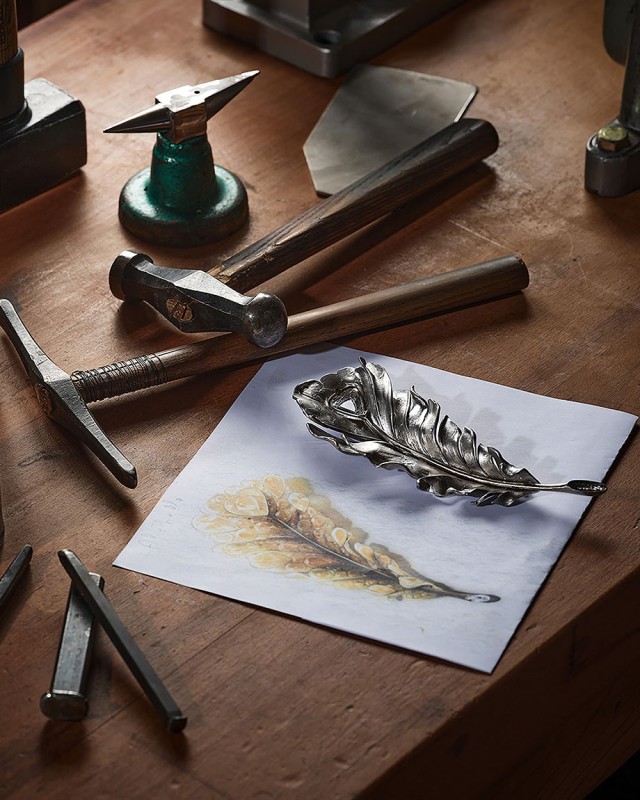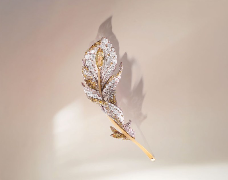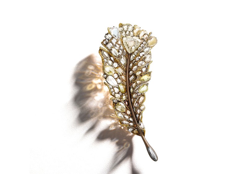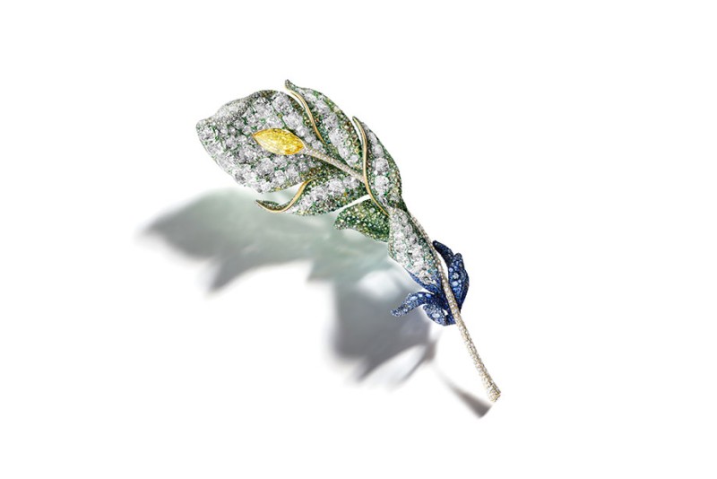 看似翠色的羽毛胸针,则使用了白钻、黄钻、沙弗莱石、蓝宝石、翠榴石、灰蓝色蓝宝石、黄绿色蓝宝石、变色石榴石,活用色彩的明暗渐层变化,塑造出栩栩如生的雕塑感。还有一件新作刻意採用牛角做为羽毛枝干,镶嵌白钻、黄钻、棕钻,顏色近似却带有不同的质感,这种搭配,亦勾勒出气质非凡的羽毛胸针。