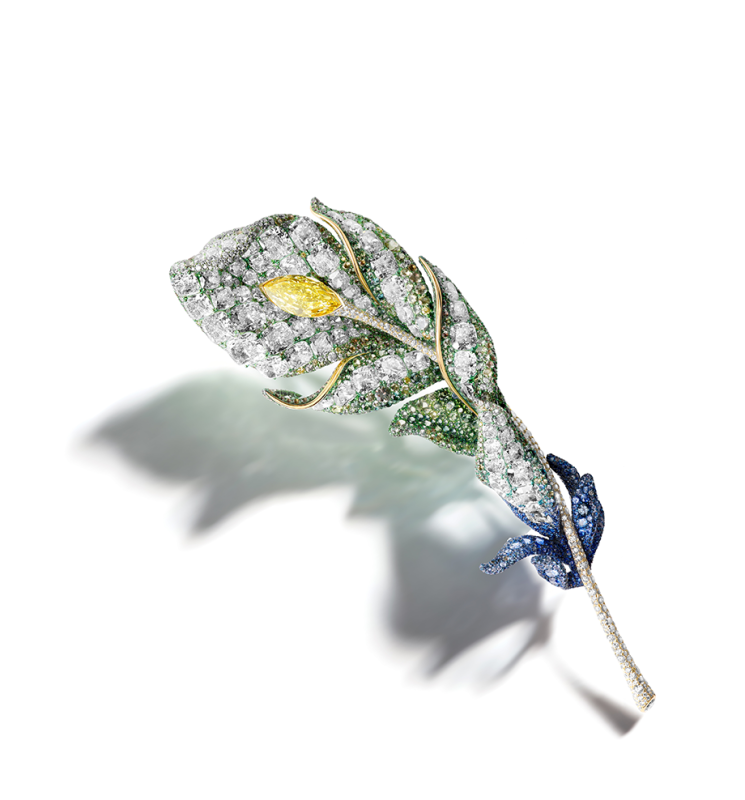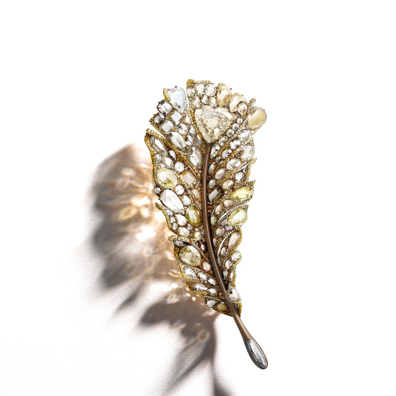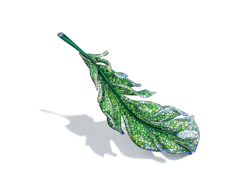 看似翠色的羽毛胸针,则使用了白钻、黄钻、沙弗莱石、蓝宝石、翠榴石、灰蓝色蓝宝石、黄绿色蓝宝石、变色石榴石,活用色彩的明暗渐层变化,塑造出栩栩如生的雕塑感。还有一件新作刻意採用牛角做为羽毛枝干,镶嵌白钻、黄钻、棕钻,顏色近似却带有不同的质感,这种搭配,亦勾勒出气质非凡的羽毛胸针。