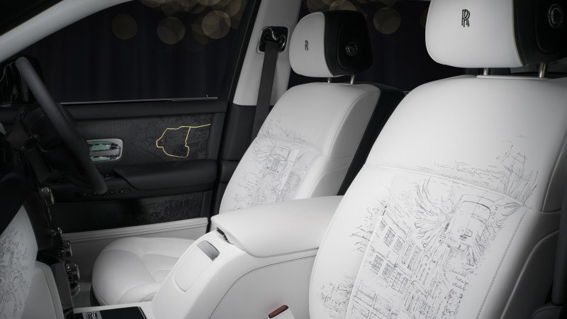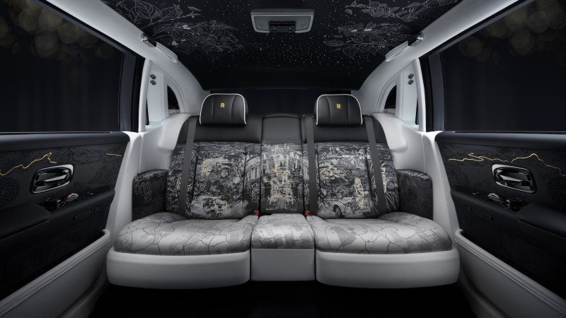 百年纪念版后座的设计灵感源自着名的 1926 年「爱之魅影」,採用奥比松(Aubusson) 手工编织的掛毯。座椅上的艺术作品透过三个不同的层次来讲述故事。第一层是背景,以高解析度印刷呈现,展示了幻影历史上的地点和文物——从幻影最初的伦敦 Conduit 街厂址到亨利·莱斯的法国南部油画。第二层也以高解析度列印,以精细的绘制细节描绘了过去伟大的幻影车型。第三层也是最上层由刺绣构成,抽象地代表了每一代幻影的七位重要车主。这款复杂的布料历时12个月与时尚工作室合作研发,这也是劳斯莱斯首次在高级订制服领域之外承接订制布料。为了满足劳斯莱斯对布料耐用性、触感和美学的严格要求,採用了专为幻影百年私人典藏系列设计的特制油墨和工艺,进一步完善了高分辨率印花工艺。