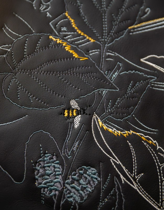 高解析度印花布料上点缀着刺绣,呈现出独特的手绘质感。 Bespoke Collective 将这种刺绣工艺描述为“用线勾勒草图”,将铅笔线条的表达方式融入织物之中。为了勾勒和定义每个图案,工匠们使用金沙线,以素描般的不规则针法,营造出线条轻盈浮于表面的错觉。贝壳线则以高密度针法,赋予布料质感与层次感。纵观整幅作品,这件精妙绝伦的工艺作品共计使用了超过 16 万针。