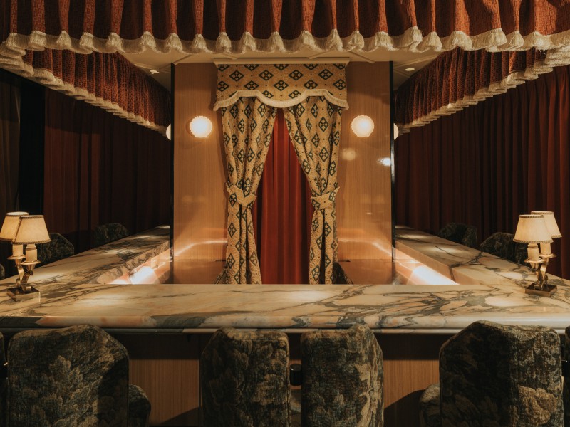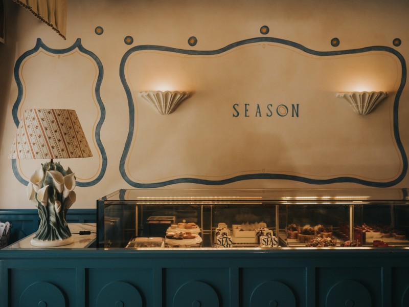 不仅能在甜点与饮品中嚐到宛如故事般新颖丰富的风味,SEASON Artisan Pâtissier的空间本身也精心设计为一座带领宾客走入故事核心的剧场。整体设计灵感取自20世纪初的新艺术运动,空间细节结合蓝色弧形线条、几何木地板与古董布料等元素,营造出介于古典优雅与当代简约之间的童话氛围。进入店内的动线依序划分为三段,入口处宛如甜点艺廊的冷藏展示区,中段为能近距离试吃常温甜点与礼盒的轻盈沙龙,最深处则通往带有 speakeasy氛围的板前甜点剧场吧台。宾客随着步伐由前而后,宛如踏上剧情转场般逐步递进,让「吃甜点」变成一种沉浸式的味蕾体验。