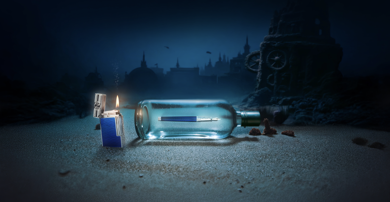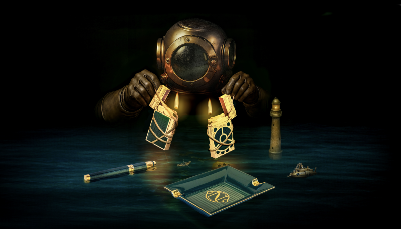 设计师以此为灵感,採用冷调蓝色亮光漆面与银色金属光泽 ,营造出鸚鵡螺号在深海暗流穿梭的冷冽与险峻。不同于太平洋系列的波光粼粼,Gulf Stream系列的Ligne 2打火机漆下雕纹充满了极致的动态感 。那些模拟洋流轨跡的刻纹,在深蓝色漆面下若隐若现,彷彿将一股强大的自然动能封印于金属之中。同系列更延伸出传统骨瓷制作的菸灰缸,以手工彩绘与铬色平版印刷重现鸚鵡螺号标志 ,以及採用锌合金镀铬与钻石雕刻纹打造的雪茄剪 ,呼应尼莫船长驾驭自然的野心与魄力。