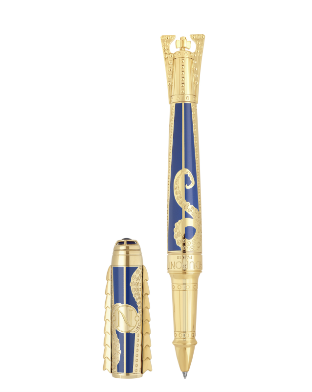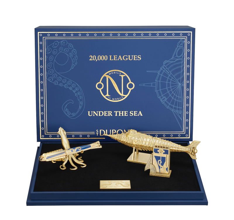 如果这趟旅程有起点,那尼莫船长的那句名言:「在永不停歇的流动中保持行动」无非是领航的最佳罗盘。作为系列中的灵魂核心,MOBILIS IN MOBILE尊荣套组并不仅仅是将黄金鸚鵡螺号「Nautilus」做成笔或打火机,而是在桌面上重建小说中那艘传奇潜艇的「灵魂」。Dupont 大胆地将象徵皇室与机械的金属金色,与深邃的海洋蓝色渐层结合,打造出Line D Eternity钢笔 与Le Grand 打火机 。在这艘「微型潜艇」上,钢笔特别镶嵌了14K黄金笔尖,笔夹更设计成指南针造型,搭配笔身上的螺旋桨与潜艇铆钉雕刻 ,呼应航海主题。