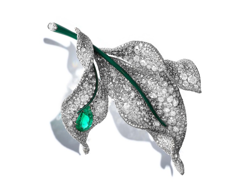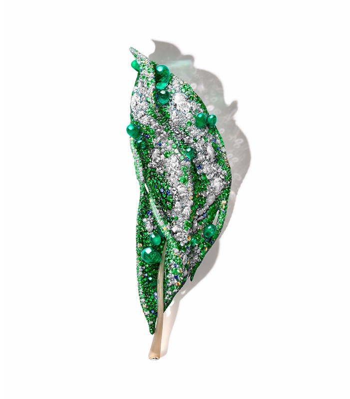 ▲四季系列 枫叶胸针。主石:3.16 克拉梨型哥伦比亚木佐绿祖母绿。配石:白钻 材质:陶瓷漆、钛金属、18K 白金