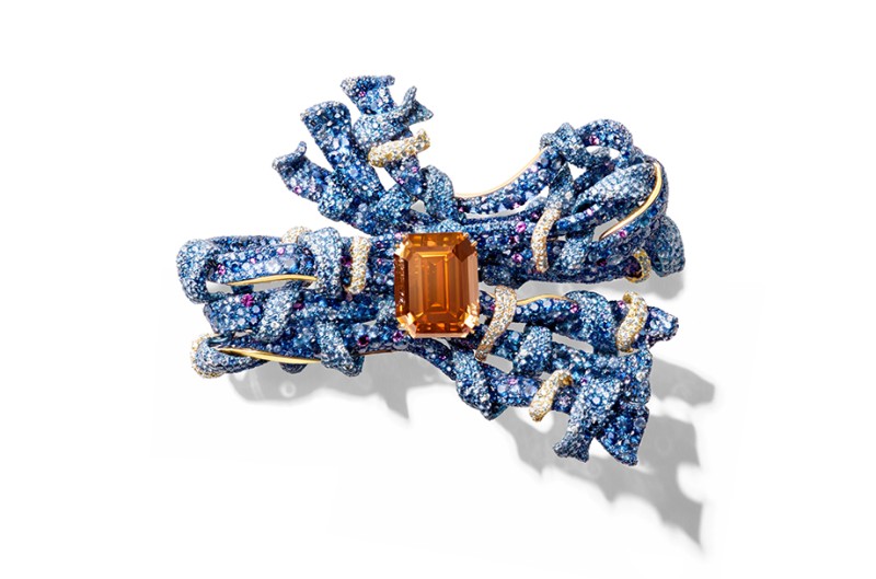 被巴黎高订工坊的手工呢绒的无比触感启发的Cindy,与欧洲资深工匠一同研发全新结构技术,创造由46条方向各异的钛金属丝带构成的胸针。每一条丝带单独进行塑形、宝石镶嵌与色彩渐层的处理,完成后再行组装,以贵金属与宝石重现编织的柔软、展现布料般的流动与飘逸。