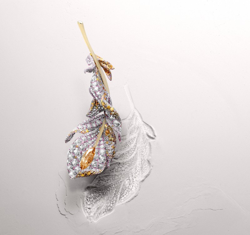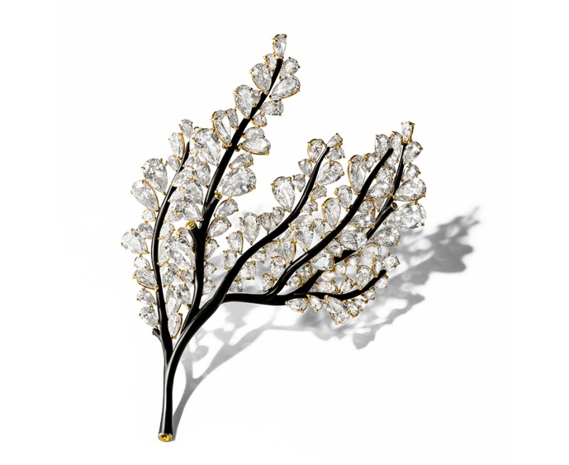 ▲四季系列 树枝胸针。用石: 白钻、黄钻。材质:钛金属、陶瓷漆、18K 白金、 18K 黄金