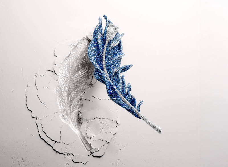 ▲羽毛胸针。主石:5.53 克拉盾型阶梯式 Type IIa 白钻。配石:白钻、蓝宝石、尖晶石、灰蓝色蓝宝石、变色石榴石。材质:钛金属、18K 白金、18K 黄金