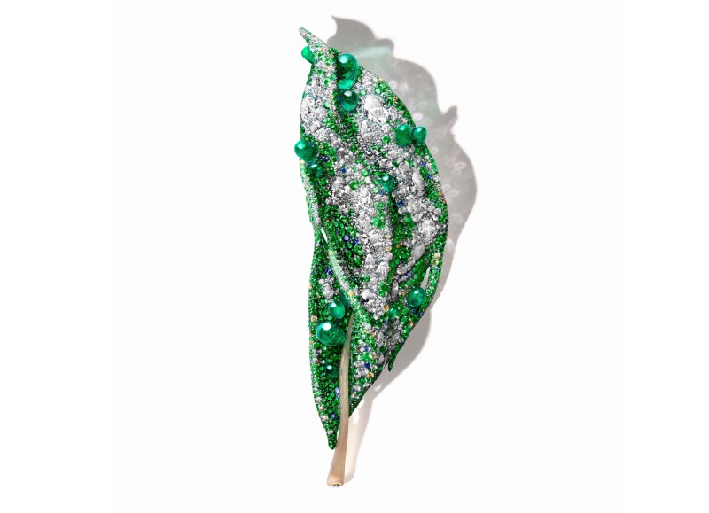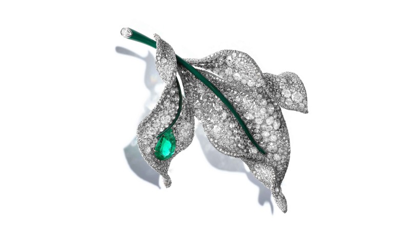 ▲四季系列 枫叶胸针。主石:3.16 克拉梨型哥伦比亚木佐绿祖母绿。配石:白钻 材质:陶瓷漆、钛金属、18K 白金