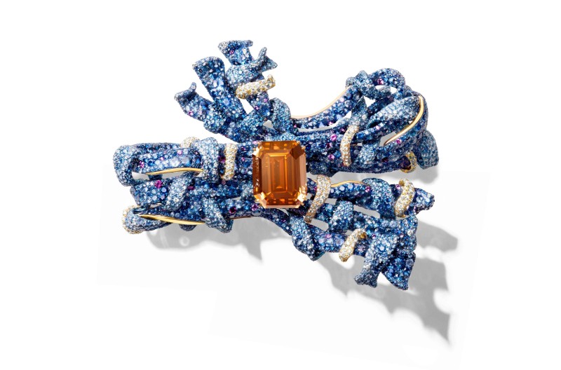 被巴黎高订工坊的手工呢绒的无比触感启发的Cindy,与欧洲资深工匠一同研发全新结构技术,创造由46条方向各异的钛金属丝带构成的胸针。每一条丝带单独进行塑形、宝石镶嵌与色彩渐层的处理,完成后再行组装,以贵金属与宝石重现编织的柔软、展现布料般的流动与飘逸。