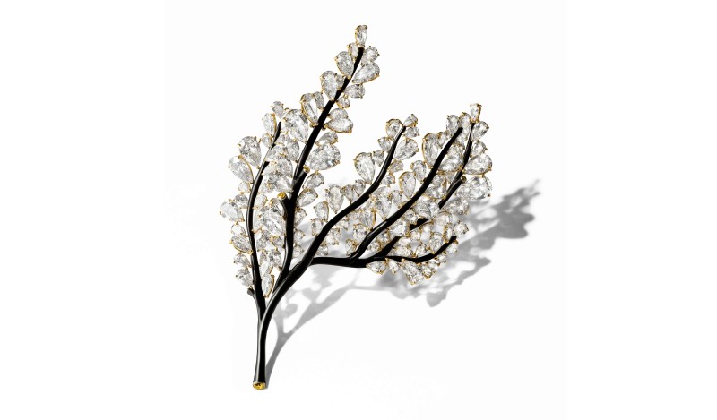 ▲四季系列 树枝胸针。用石: 白钻、黄钻。材质:钛金属、陶瓷漆、18K 白金、 18K 黄金