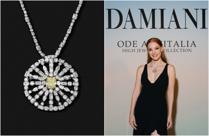 DAMIANI随后于晚间举办志庆专卖店开幕的贵宾晚宴,Guido Damiani、Silvia Damiani与洁西卡.雀丝坦三人亲自迎接当地尊贵宾客,期间特别安排模特儿佩戴《Ode all’Italia》系列作品进行展示,让珠宝在光影流动之间,完美演绎此系列独特的设计风格与工艺美感。洁西卡.雀丝坦于当晚贵宾晚宴佩戴Aethernitas高级珠宝项链惊艳现身,作品以白金打造,镶嵌珍稀黄绿色彩钻,设计灵感源自罗马壮丽建筑意象,向永恆之城致以崇高敬意,完美诠释《Ode all’Italia》所蕴含的时间、文明与情感深度。