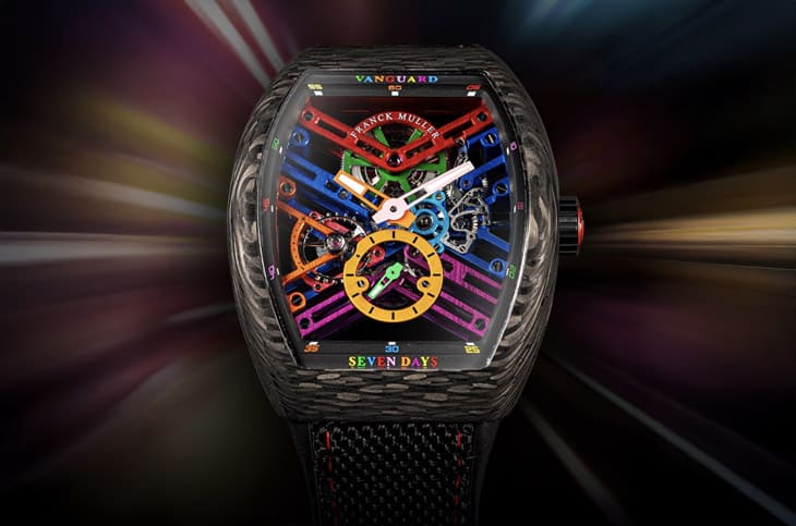 ▲FRANCK MULLER Vanguard Skeleton Color Dreams採碳纤维表壳与七日链镂空机芯,彩色时标呈现活泼又稳重气质。