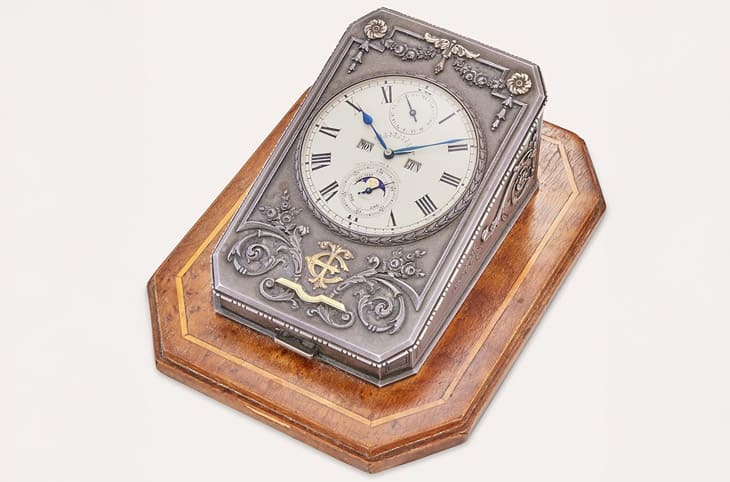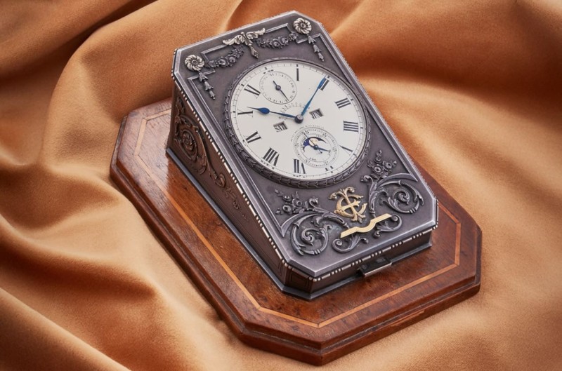 从机械与美学角度来看,「艾默里座钟」无疑是非凡之作,它採用「纸镇式」(Presse-Papier)设计,具备万年历、月相显示和十日动力储存功能,安置于雕刻精美的银金表壳上,刻有艾默里的个人姓名缩写。Schnipper曾致电百达翡丽博物馆馆长Peter Friess博士确认,问到「Peter,你有听说过第三座这种钟吗?」馆长斩钉截铁地回答:「绝对没有。」