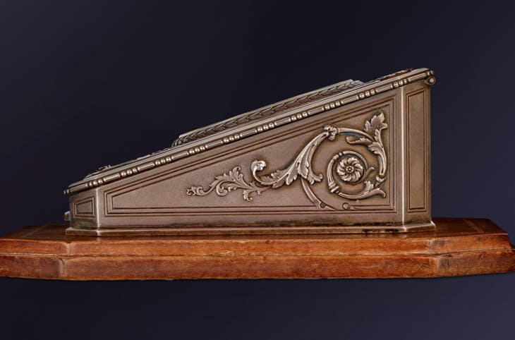 ▲银金钟壳的雕花精美,底座八角木质镶嵌,展现奢华工艺与细腻雕刻。Source:Sotheby's
