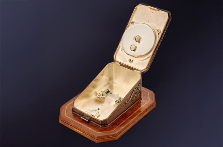▲纸镇式结构,按下按钮可以开启顶盖,露出原装上链与调校插销,操作优雅精巧。Source:Sotheby's