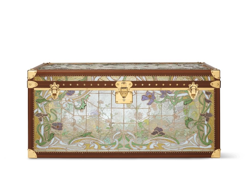 「绿野梦境DREAM OF COUNTRY」描摹闲适盎然的公园绿意风光,本展间亦呈献女士高级订制服、粉嫩色彩珍稀皮革包款,以及经典顶级珠宝系列。路易威登家族老宅暨制箱工坊Asnières的新艺术风格(Art Nouveau) 雕花窗櫺成为一款典雅的Maison de Famille彩色玻璃硬箱灵感来源。这款彩色玻璃硬箱耗时800小时制作,1500片玻璃以蒂芙尼工艺(Tiffany Technique) 组装和铜箔焊接,每片玻璃都用黏性铜箔包裹。将铜箔边缘折叠到玻璃上,形成U形,为焊接做好准备;接下来珐琅彩绘的重复工序则将珐琅玻璃顏料一层层涂抹,并在窑炉中多次烧制,使每一层都永久熔合到玻璃上,从而形成色彩、阴影和细节,成就这款匠心独运的艺术品。