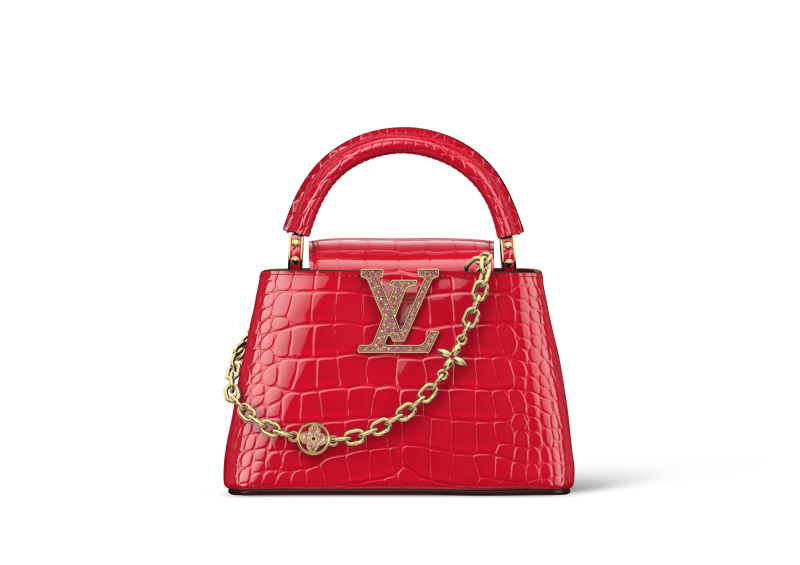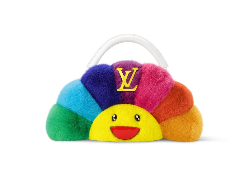 多款Capucines Mini珍稀皮革包款精工之作点缀蓝宝石色、灵感来自854 Rouge Louis路易红LV Rouge唇膏的琉璃红色、浅金色、沙漠金色等鱷鱼皮革饰面,白色鱷鱼皮革饰面则以精致珠饰和水晶刺绣勾勒Monogram花朵姿态。Artycapcines系列第七篇章与村上隆合作的Capucines East West包款,以色彩繽纷的貂皮毛覆盖,呈现日本艺术家标志性彩虹花设计。