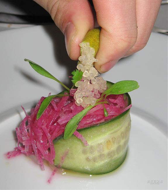 近來有在關注美食資訊的人應該有聽說「手指檸檬(finger lime)」這種有趣的食材,乍看彷彿是魚子醬的模樣,但其實這可完完全全就是素食。手指檸檬外形酷似手指,也被稱作指橙、拇指檸檬,表面略為粗糙,乍看之下容易讓人誤認成小巧的瓜類。不過,別看它長得其貌不揚,在平凡的外表下,內含一顆顆晶瑩剔透的果肉,色彩多變令人目眩神迷,素有「植物中的魚子醬」之美稱。