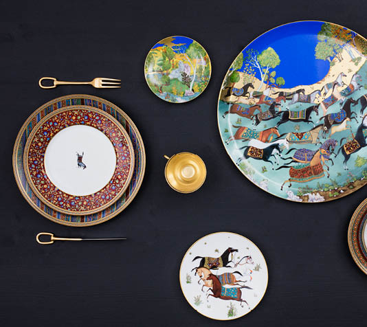 愛馬仕於時尚圈已成為頂級代名詞,除了皮件、絲巾、衣著外,餐具也不例外。成立於1837年的愛馬仕,數十年之後於1984年發展出餐瓷商品。在設計上除了常以它的品牌logo與經典圖騰,讓紳士名媛能在餐桌上展現自己對於愛馬仕的極致愛好,與衣櫥中、身上擁有的其他愛馬仕單品互相輝映。