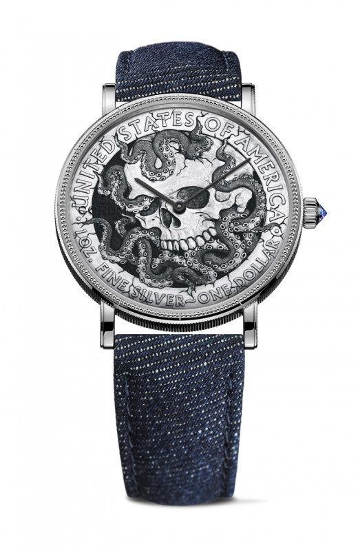 每枚流浪幣均完全由手工雕刻,與眾不同。阿列克謝.薩布羅夫為品牌創作新穎獨特的圖案,用作43毫米直徑腕錶的面盤,搭載自制自動上鍊機械機芯。此全新「錢幣」腕錶系列的獨特時計將首度搭配牛仔錶帶。灰藍色調與銀色錶殼及裝飾一顆藍寶石的錶冠和諧配搭。