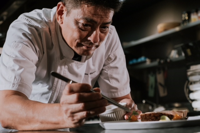 主廚Bryan Nagao揉合傳統和現代義法式烹飪技術,運用台灣本地食材,並以菜餚及酒款須相互提升香氣與口感為概念,選用濃郁風味的海膽、蛋,創作“Pipikalua” Wagyu Sirloin, Uni, Tamago, Sapphire夏威夷Pipikaula和牛沙朗、海膽、蛋、海蘆筍。另一道是Chicken Breast “Lychee-Chili Glazed” Cured Duck Egg Yolk, Dragons Buds炭烤荔枝雞胸、醃蛋黃、火龍果花,以風味十足帶著炭火煙燻味及些許辣味,佐以當季荔枝的雞肉料理,加上極具巧思的醃蛋黃、火龍果花提起了鮮、甜滋味,展現出豐富的層次,創作出一道無可言喻又耐人尋味的美味。再搭配軒尼詩X.O佐冰塊,讓多層次風味的料理與柔滑口感的軒尼詩X.O在口中釋放,宛如一場味蕾的交響樂交織出美妙和諧,帶給味覺享受的昇華。
