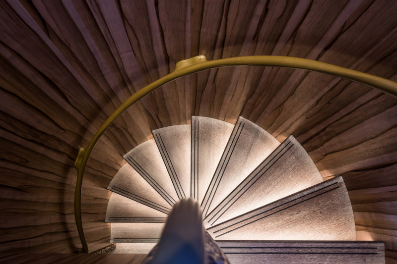 樓梯設計也是亮點之一,彷彿將船隻的科幻故事延續下去。四周彎曲的木頭不容易處理,在造工上有一定難度。從社交空間走到私人的主人套房及船員艙,風格稍有不同。雖然同樣略帶科幻感的太空船艙模樣,但空間設計更強調舒適感,以及奢華氣勢。延續此前的雕刻金屬飾面和木材,設計師還混搭了石材和樹脂。