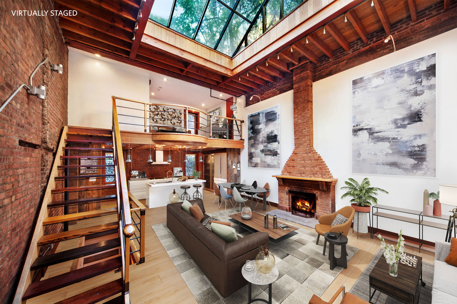 也因為單位過去是劇院的關係,因此房子不免俗有挑高的設計,只見客廳17英尺的橫梁天花板,巨大的工作室天窗,裸露的磚牆,寬闊的木質地板,一個大型燃木壁爐和兩個室外空間,這個多功能空間面積為1,800平方英尺,分佈在兩層半的地板上,並配有高檔現代設施,如Boffi廚房,Gaggenau電器和加熱地板。