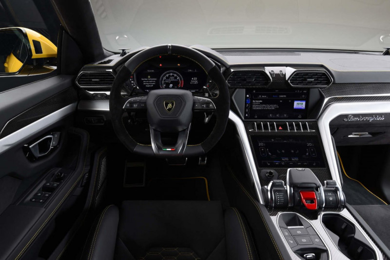 Urus的內裝部分受到 LM002和Aventador、Huracán啟發,座艙內儀錶盤全面改用液晶螢幕取代,中控台將實體按鍵幾乎簡化,整合進上方10.1吋、下方8.6吋的液晶螢幕。Tamburo 駕駛動態選擇器位於中控台,可切換STRADA(道路)、SPORT(運動)、 CORSA(賽道)模式、 NEVE(雪地)模式,TERRA(荒野)和 SABBIA(沙地)為選配。主動式減震懸吊可由 ANIMA 駕駛模式選擇器自動適應,或駕駛者自己從EGO自訂模式調節剛度,實現或平穩舒適或極致動感的駕駛體驗。三輻方向盤內含減震器,增強駕駛舒適性。