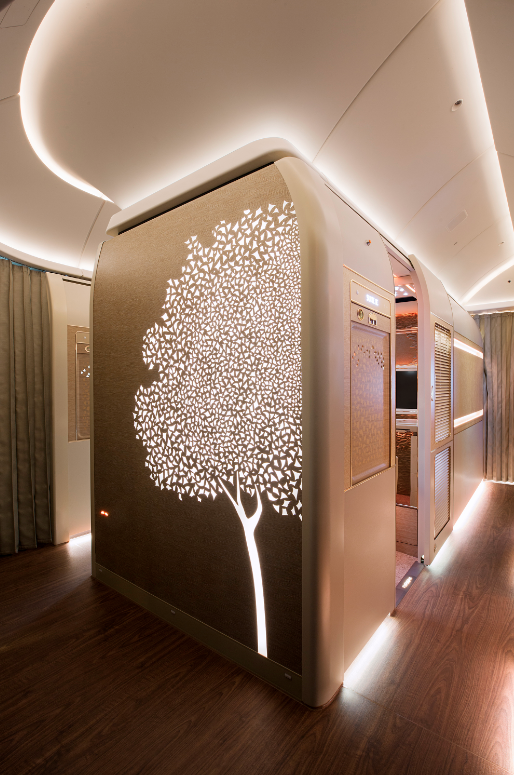 ▲頭等艙套房採用挑頂式的全覆式隔門設計,裝飾元素是阿聯酋的牧豆樹(Ghaf Tree)