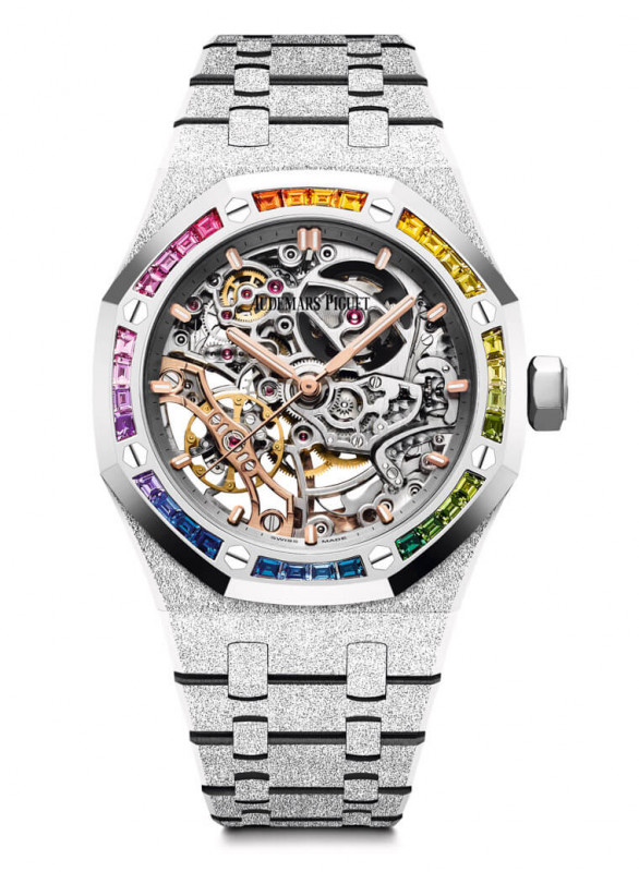 ▲霜金錶殼原本已經很具視覺魅力,愛彼再於錶圈上鑲上多達32顆的彩色藍寶石,每顆鑽石的顏色都不同,形成視覺上巧妙的漸層變色效果。