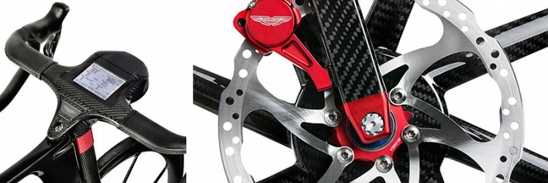 Aston Martin奧斯頓馬丁與Factor Bikes合作,在2011年推出One-77 Factor Cycle,全球限量 77 台。依然是輕盈的碳纖維結構,車重9.5公斤,要價3.9萬美金。本身可以連接Wi-Fi、藍牙,讓騎乘的時光不錯失與他人交流的機會,還能偵測使用者的心律、紀錄運動時的表現。