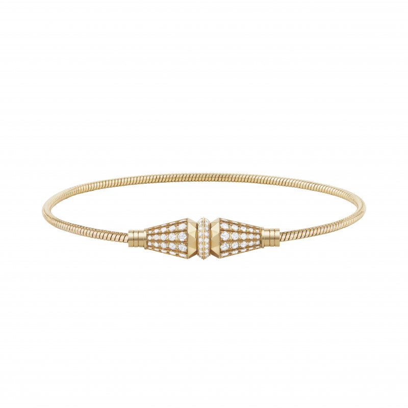 Delilah系列以更加現代和設計感的詮釋回歸,同時保持了強烈的身份象徵。設計師的妙手讓黃金煥發了新的生機,黃金變成了真正的綢絹,像絲綢般柔軟又充滿活力。如同附著女人身上的第二層皮膚,流暢輕盈。可以任意自由佩戴:當作髮飾或佩戴於頸間或腰間。