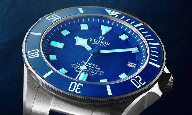 2015年Pelagos開始換裝自製的MT 5612機芯,與此同時推出了藍面藍圈的新色。官方資料中點出這藍色是取材自品牌過去的潛水錶款,但其實古董帝舵潛水錶的藍比較接近海軍藍,跟這款的淺藍頗異其趣,其間的連結主要是精神上的。自製機芯具備了天文台認證,因此面盤的下半部標示有相關字樣,像這樣密密麻麻的印字應該也很對勞力士/帝舵玩家的胃口。