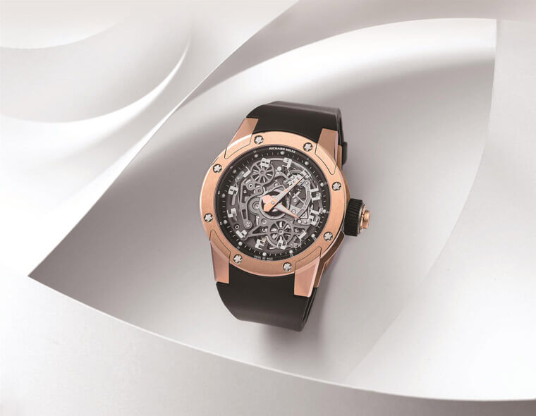 RM 63-01與品牌其他的圓形作品不同,是第一款採用曲面上層錶殼的圓形腕錶。以紅金打造錶徑42.7mm的錶殼,藍寶石水晶錶面印有數字時標,保護著劍形指針與輕盈堅固的鈦合金底板。動力心臟搭載RICHARD MILLE開發的CRMA3自動上鍊機芯,為5級鈦合金材質,經PVD鍍層處理,並配備5N紅金雙向自動盤,動力儲備達50小時。