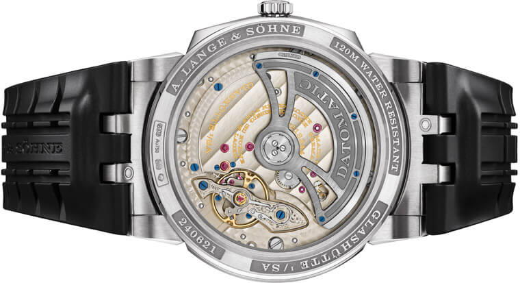新款雖換了材質但是錶背還是透明底蓋設計,露出朗格專為Odysseus研發的L155.1 Datomatic自動機芯,這枚機芯有幾個地方可以看出朗格為強化它的運動感以及現代感而作出調整,首先光是自動上鍊這點就是一個更貼近運動錶的設定,再來它的擺輪震頻也提高到4Hz(通常朗格手錶的震頻還是以3Hz居多),此外為了提升手錶的穩定性以更適於日常休閒活動佩戴,品牌也別開生面將擺輪夾板從單臂式改良變成橫跨式橋板。不過有一點可能比較不像運動錶,那就是朗格細膩講究的機芯打磨工藝,這款錶的格拉蘇蒂紋、魚鱗紋以及擺輪橋板的雕花比起一般運動錶精緻許多,剛好這款又是白金材質,想想其實也是非常合理的高級錶規格。