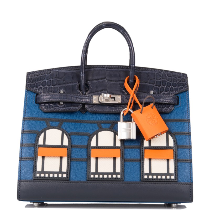 這款特殊的柏金包是愛馬仕僅為VIP特製的,包包正面的圖案為巴黎聖奧諾雷市郊路24號的旗艦店,愛馬仕向其傳奇店面致敬。包包結合了五種不同的皮革以及鱷魚皮和鈀金配件。包身主要由Madame⼩⽜⽪製成,在海軍藍的底部和上蓋則使用了頂級鱷魚皮革。正面的分層⽪⾰則讓包包擁有立體感十足的視覺效果,前衛的外觀設計又不失典雅,讓人感受到愛馬仕強大的製包技術。