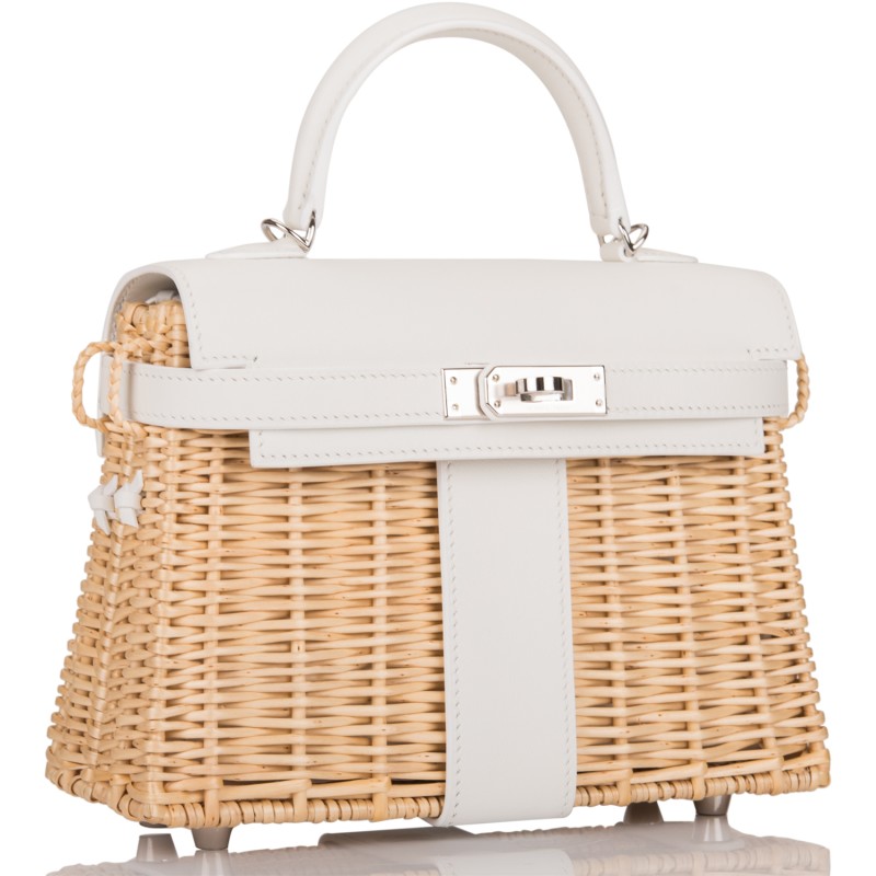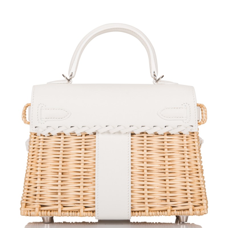 3.Hermès White Mini Kelly Picnic 20cm of Osier Wicker and Swift Leather with Palladium Hardware
